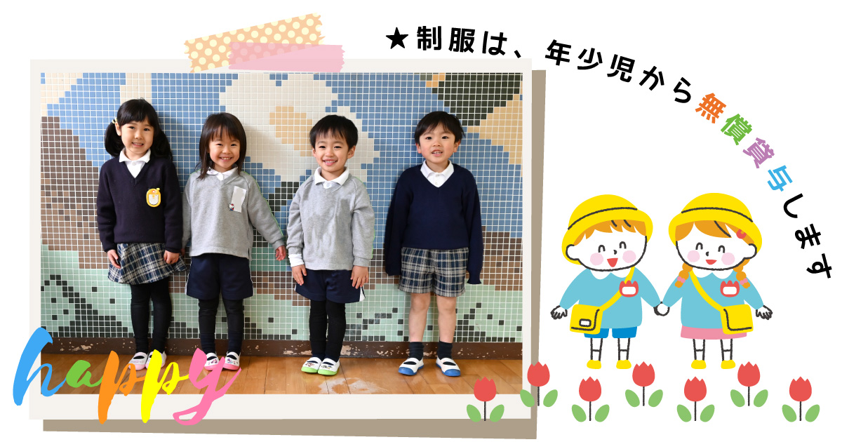 年少児さんから制服着用になると聞いたのですが・・・ 幼稚園の部にあがるのを機に、年少児から制服着用となります。制服は無償貸与いたします(1回のみ) 実費負担で買い揃えるものはありますか? 【園指定】体操服・カラー帽子・名札 【園指定なし】 靴下(紺色)・靴・バッグ・上履きシューズのご用意をお願い致します