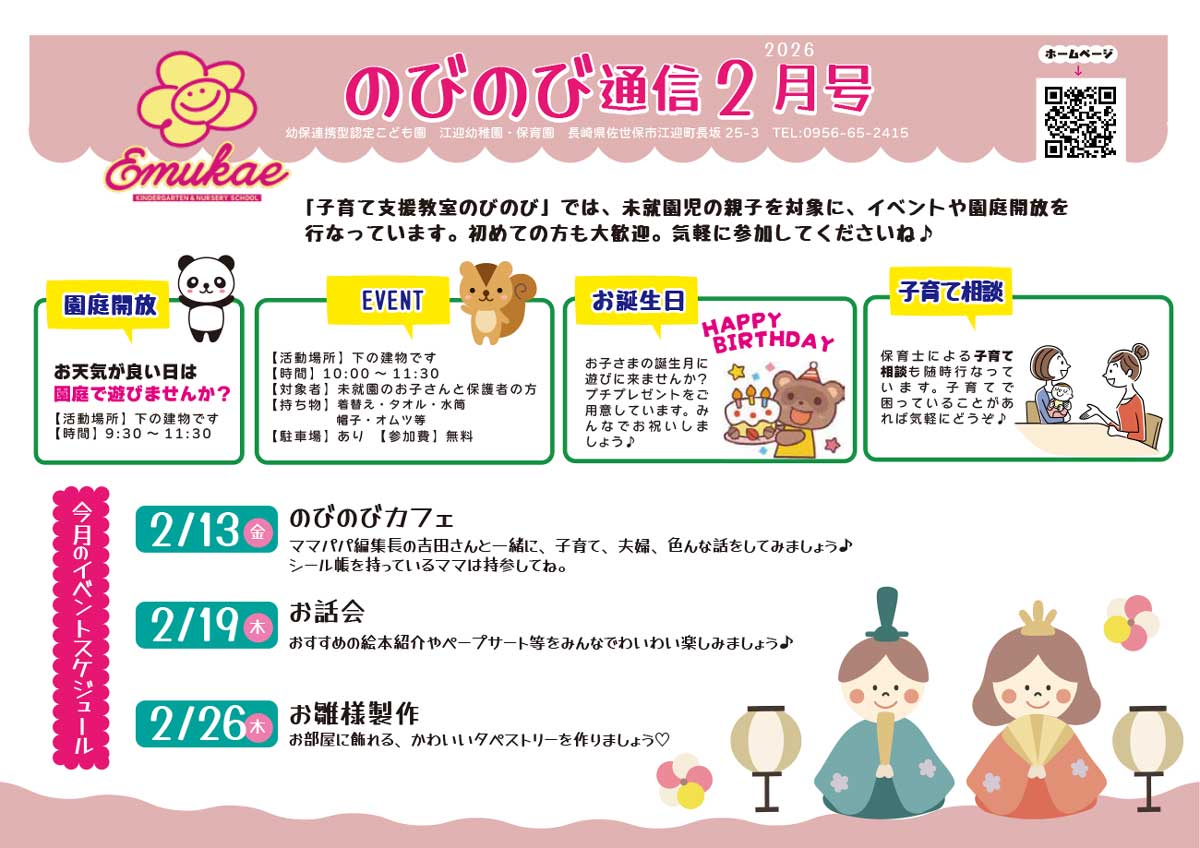 HOME > 子育て支援のびのび > のびのび通信 > のびのび通信2026年2月号発行しました♪ 2026-01-29 江迎保育園に遊びに来ませんか?楽しいイベントや親子遊びなど保育士と一緒に楽しい時間を過ごしましょう♪子育て支援のびのびについてはこちらをクリックしてね -のびのび通信, 子育て支援のびのび -2026, のびのび通信, 未就園児対象, 未就園児教室