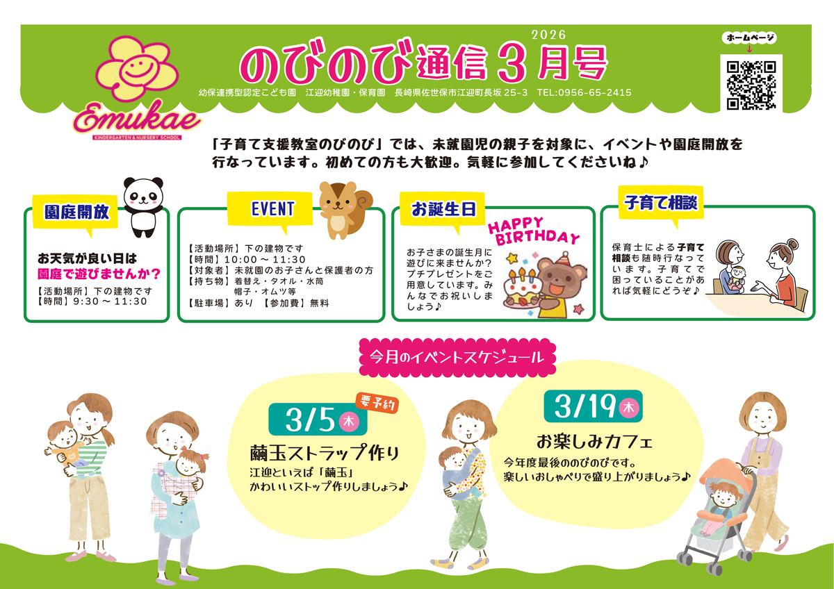 HOME > 子育て支援のびのび > のびのび通信 > のびのび通信2026年3月号発行しました♪ 2026-02-26 江迎保育園に遊びに来ませんか?楽しいイベントや親子遊びなど保育士と一緒に楽しい時間を過ごしましょう♪子育て支援のびのびについてはこちらをクリックしてね -のびのび通信, 子育て支援のびのび -2026, のびのび通信, 未就園児対象, 未就園児教室